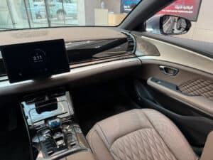Cần số điện tử nhỏ gọn cùng khu vực điều khiển trung tâm được ốp gỗ càng làm nổi bật phong cách cao cấp của chiếc sedan này.